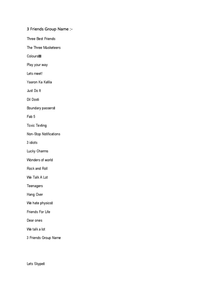 Group names for friends. Reely Good Friends. Group Names Chat For 4 Friends Worldwide Wolfpack Final Four Dont care but we like you The Solid Four-tresses Fortnite and Chill Met-A-Four Unknown Friends Four Sisters Across Borders The Wolf Pack Hot Shots The Fly Four Strong Signals. The name of the team name inspiration is stated as well.
