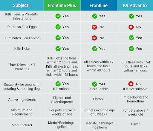 These products are designed for household pets particularly dogs and cats. Frontline and Frontline Plus are two medications and preventive products by Merial. For dogs and cats that might not sit still long enough for a topical solution Frontline Spray is a misting all-over spray.